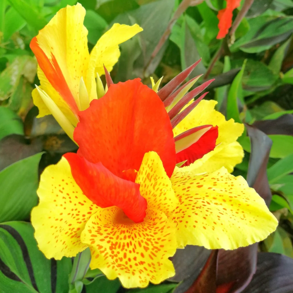 Un soi spectaculos, cu flori galben-roșiatice și aspect exotic. Florile sunt mari și atrăgătoare, bicolore, cu petale galbene și roșii în proporții variabile, sau cu pete roșiatice pe petalele galbene, ceea ce creează un efect vizual interesant. Frunzele sunt mari, lanceolate și decorative, având nuanțe variate: verde, bronz-purpuriu sau tonuri mixte. Canna înflorește din august până la mijlocul toamnei. Se plantează în locuri însorite, în sol bine drenat. Pachetul conţine 1 rizom.