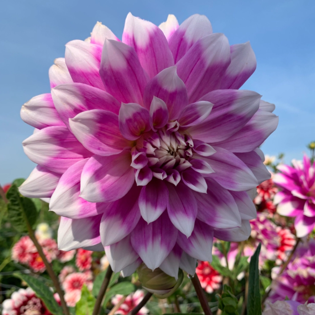 Această dalie bicoloră produce flori mari, duble, de aproximativ 15–20 cm în diametru, uneori chiar peste 20 cm, într-o combinație fascinantă de mov cu vârfuri sau albe, care creează un contrast fin și elegant. Petalele largi, aranjate dens, oferă un aspect plin și bogat florilor. Dalia se plantează în locuri însorite, în sol bine drenat. Înflorește bogat din mijlocul verii până la primele geruri din toamnă. Pachetul conține 1 rizom.