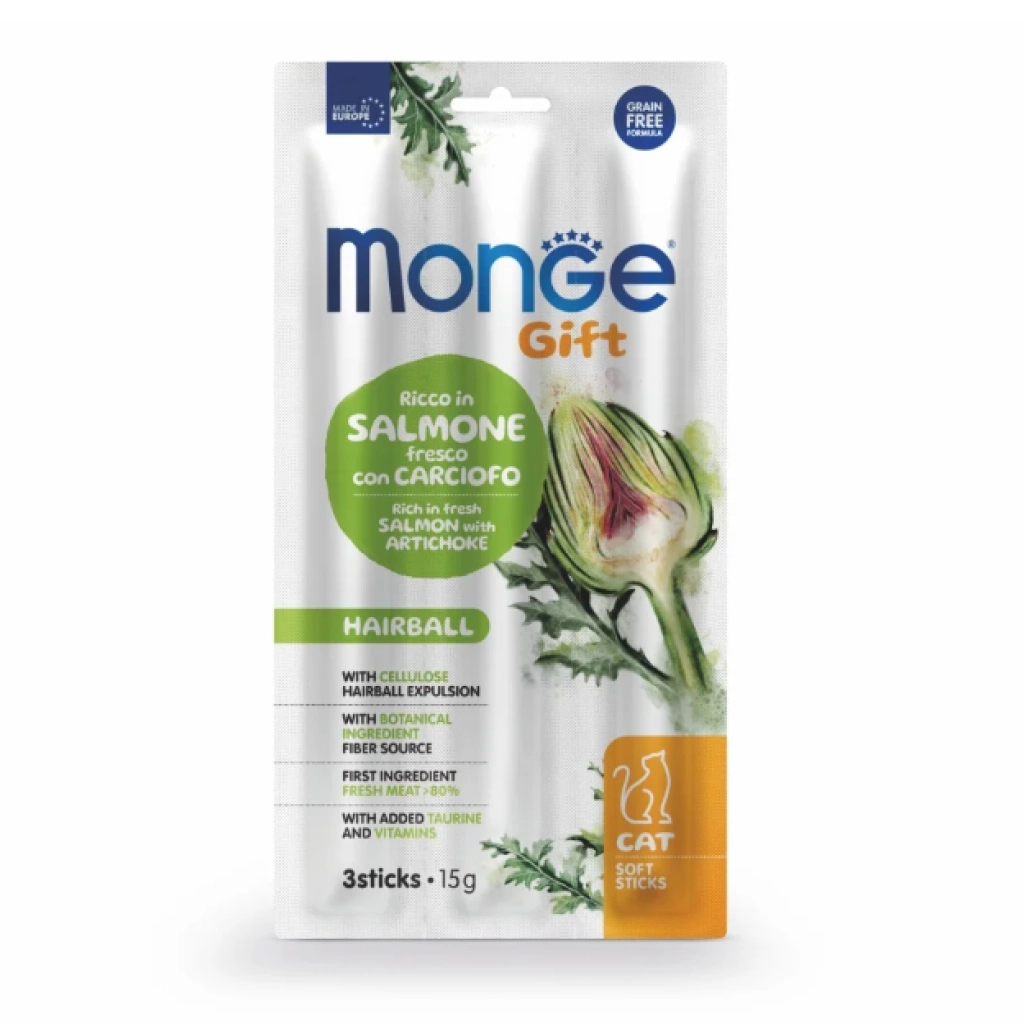 Monge Gift Sticks pentru pisici adulte, recompense pentru prevenirea ghemotoacelor de blană cu somon și anghinare este o hrană complementară pentru pisicile adulte. Dezvoltată special pentru bunăstarea pisicii tale, include celuloză pentru a promova eliminarea fiziologică a ghemotoacelor de păr și un conținut redus de grăsimi* pentru a ajuta la menținerea greutății corporale ideale. Formulată fără cereale și cu carne proaspătă, o sursă valoroasă de proteine ușor digerabile cu valoare biologică ridicată. Formula este îmbogățită cu taurină pentru a susține vederea și funcția cardiacă normală și cu vitamine pentru vitalitatea zilnică. Includerea ingredientelor botanice, cum ar fi frunzele de anghinare, o sursă de fibre insolubile pentru regularitatea intestinală, este rezultatul cercetării Made in Italy pentru a susține calitatea vieții pisicilor noastre. Fără coloranți artificiali și zaharuri adăugate.