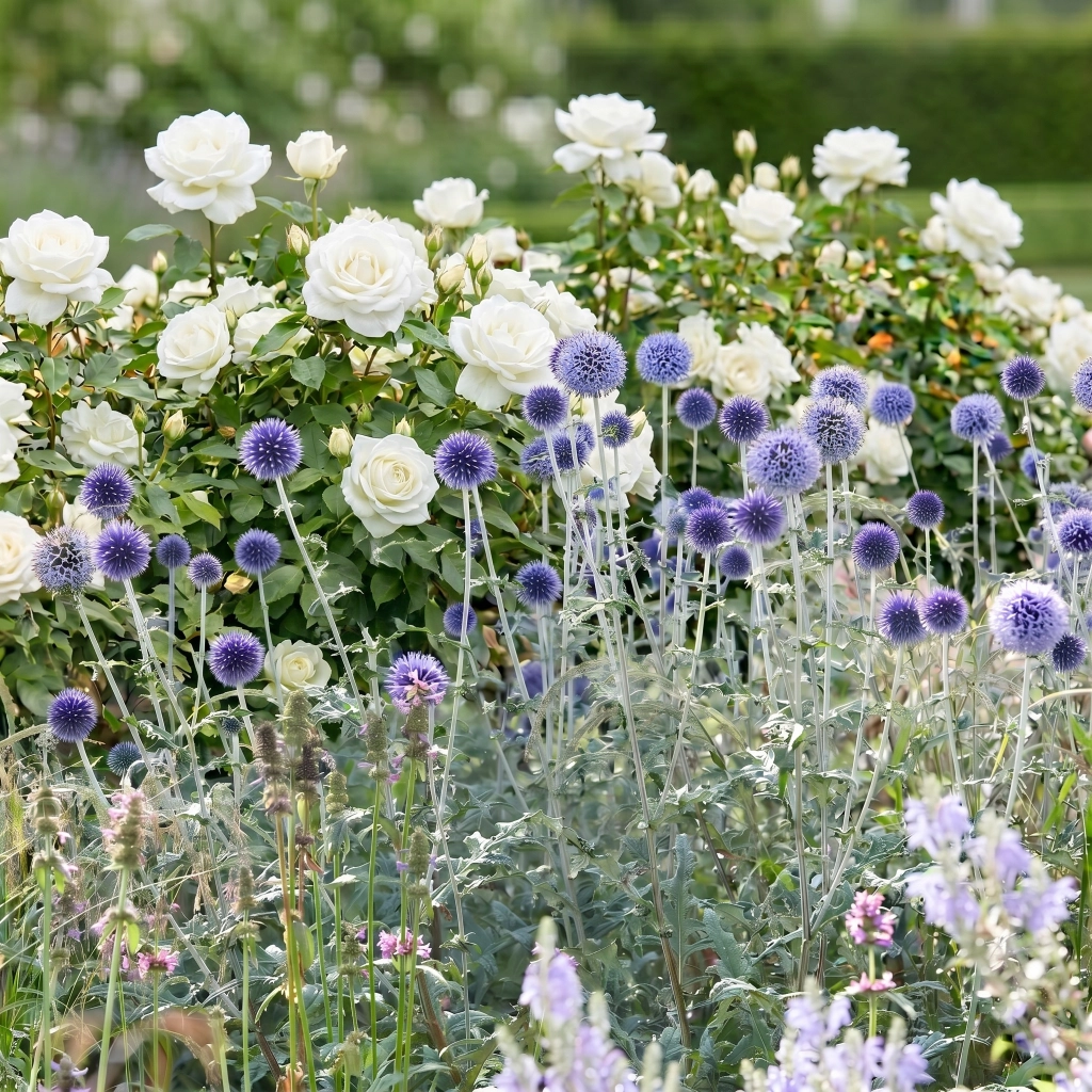Un contrast bine definit între forme și culori face ca acest pachet să iasă ușor în evidență. Trandafirul Bianca impresionează prin florile sale albe, cu un aspect curat și rafinat, în timp ce Echinops aduce un contrast interesant prin forma sferică a florilor și culoarea sa albastră, ușor metalică. Împreună, creează un joc vizual plăcut între linii clasice și accente moderne. Pachetul conține 3 butași de trandafir Bianca și 3 ghivece de Echinops Blue Glow. Se plantează în locuri însorite, în sol bine drenat.
