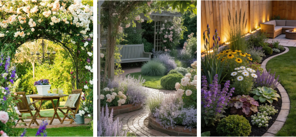 O arcadă cu trandafiri cățărători, albi sau roz-pal, devine imediat punctul de atracție al grădinii. Sub ea, o bancă simplă de lemn poate fi locul ideal unde să te așezi dimineața cu cafeaua sau seara, după o zi lungă. Parfumul trandafirilor completează perfect imaginea de vis a grădinii.