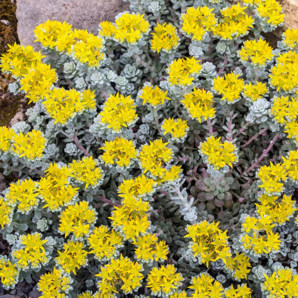 O plantă suculentă, veşnic verde, cu creştere târâtoare, folosită în principal ca plantă de acoperire a solului. Frunzele sunt acoperite cu un strat ceros alb, care le conferă o culoare argintie-albăstruie, mai intensă la lumină puternică. În sezonul rece, frunzişul poate căpăta nuanțe violet. Florile galbene, stelate, apar vara în buchete mici în vârful tulpinilor. Planta matură tolerează solurile sărace şi seceta prelungită, dar nu suportă solurile umede sau cu drenaj deficitar, mai ales iarna. Se pretează excelent pentru stâncării şi borduri însorite. Poate fi crescută și în ghivece, pe terase.