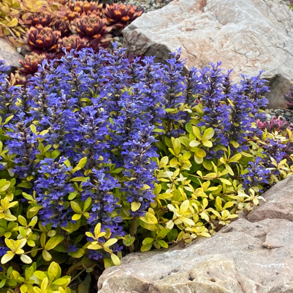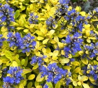 Un soi de vinețică cu frunziș auriu, oferind o alternativă strălucitoare față de soiurile clasice cu frunze verzi sau în tonuri de bronz. Covorul dens pe care îl formează rapid înfrumusețează zonele umbrite și semiumbrite, aducând lumină acolo unde alte plante nu prosperă. Înflorește din a doua parte a primăverii până în vară. Spicele de flori albastru-cobalt contrastează spectaculos cu frunzișul galben-auriu, transformând grădina într-un tablou viu. Planta este veșnic verde, rezistentă la ger, și se descurcă bine în sol bine drenat, cu umiditate moderată. Udarea ocazională în perioadele secetoase este suficientă pentru a o menține viguroasă.