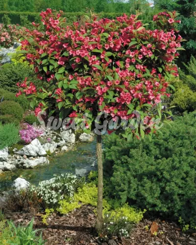 O Weigela nemaipomenită, cu aspect de copăcel. Ce-și pot dori mai mult, iubitorii acestui tip de arbust ornamental? Dacă de regulă se dezvoltă sub formă de tufă, acest soi este cu totul deseobit, datorită dezvoltării sale pe tulpină înaltă. Va decora grădinile sau terasele, prin coroana sa densă și bogată, plină cu floricele sale roz-roșiatice sub formă de pâlnie. Frunzele le vor scoate și mai tare în evidență, au o nuanță închisă de verde, iar mugurii sunt roșiatici. Preferă locurile însorite. Plantă la ghiveci.