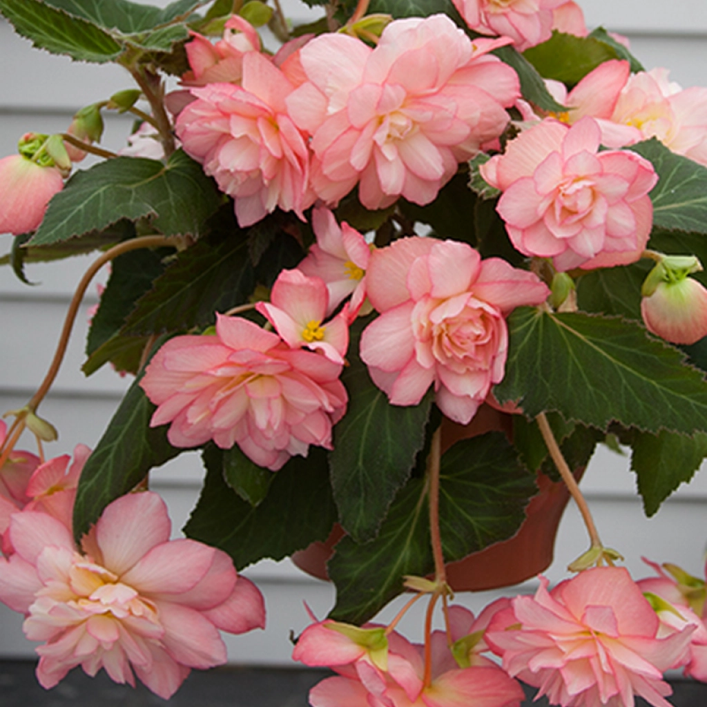 O varietate splendidă de begonii cu flori mari, pline, care au petale albe conturate cu roz intens. Înfloresc neîncetat din mai, până la sfârşitul lunii octombrie. Pachetul conţine 2 bulbi.