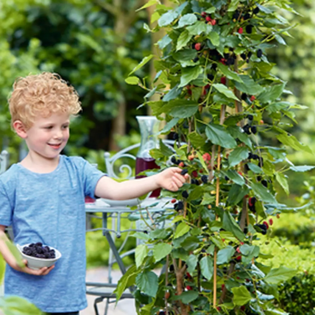 Un soi NOU de dud pitic, ce crește sub formă de arbust columnar. Produce fructe atât pe lăstarii vechi, cât și pe cei noi, pentru o lungă perioadă de timp, începând din luna iunie până în septembrie. Veți putea culege dude delicioase chiar din primul an, după plantare. Ceea ce îl deosebește de alte soiuri, care rodesc doar pentru o scurtă perioadă, de aproximativ trei săptămâni, spre sfârșitul verii și după destul de mulți ani, de la plantare. Fructele pot fi folosite cu succes în gemuri, prăjituri sau tot felul de alte preparate culinare, dar și proaspăt culese și servite ca o gustare sănătoasă. Se plantează în sol fertil, bine drenat; solitar sau mai multe plante în linie, pentru a forma o bordură roditoare. Se amplasează în locuri însorite.