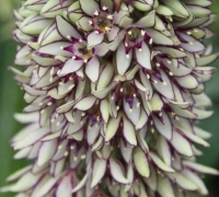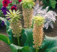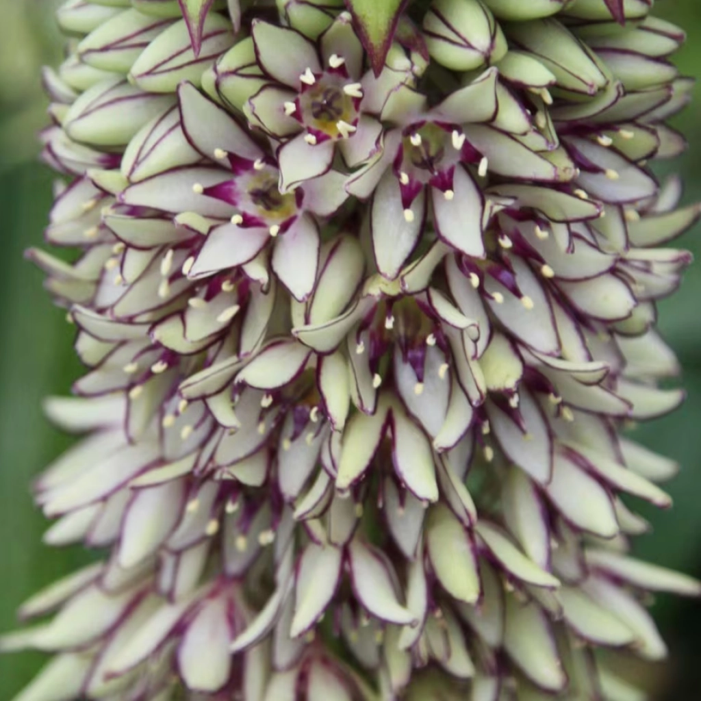 Această plantă inedită se remarcă prin inflorescențele sale neobișnuite, care seamănă cu un ananas. Florile sunt mici, de culoare verde pal, cu margini purpurii, dispuse dens pe tijele florale. Această combinație de culori conferă plantei un aspect bicolor atrăgător. Frunzele sunt late, de un verde intens, și completează estetic inflorescențele. Datorită aspectului său exotic și a culorilor contrastante, va fi unul din punctele de atracție a grădinii în timpul verii. Se plantează în locuri însorite. Pachetul conține 1 bulb.