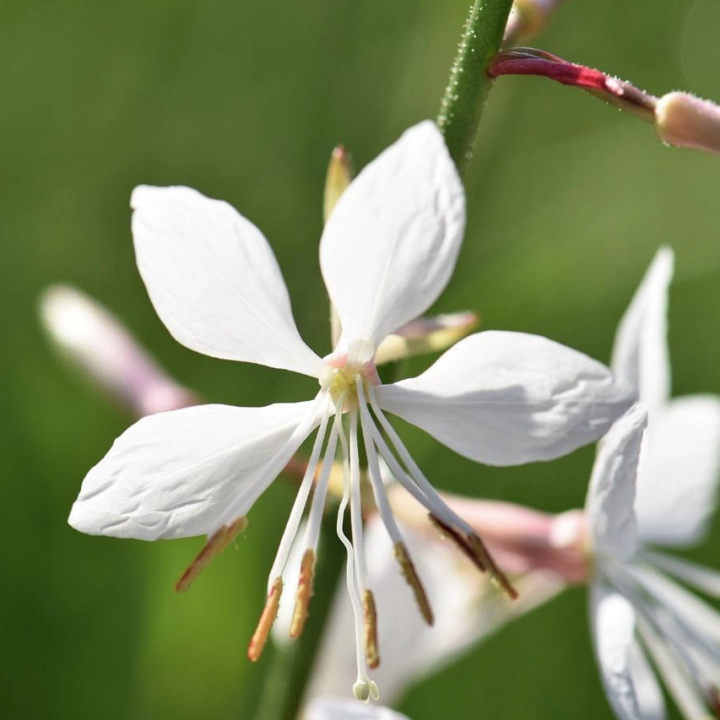 Gaura alb este o plantă perenă cu un sezon de înflorire foarte lung. Răsare la sfârșitul primăverii, are o creștere viguroasă și tulpini mai lemnoase. Înflorește abundent pe toată durata verii și în prima parte a toamnei. Florile acestui soi sunt albe, iar frunzișul este variegat, îmbinând nuanțe de verde închis și verde deschis. Este o plantă nepretențioasă, foarte ușor de îngrijit. Se plantează în locuri însorite, în sol bine drenat.