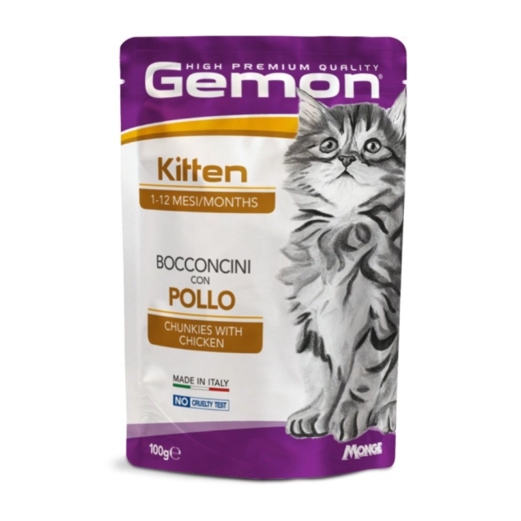 Gemon Cat Kitten Pouches-Chunkies Pui hrană umedă pentru pisoi, pui plic 100 g este o hrană umedă completă și echilibrată, special formulată pentru pisoi în creștere. Această rețetă delicioasă cu pui este concepută pentru a susține dezvoltarea armonioasă și vitalitatea puiului de pisică în primul an de viață.