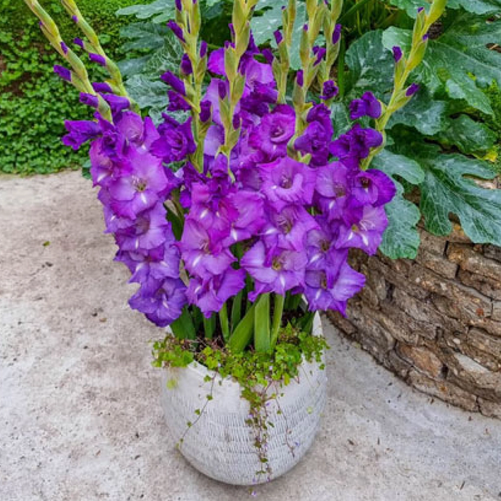 Un soi de gladiole special selectat pentru cultivarea în ghivece. Aceste gladiole au tulpini mai scurte decât soiurile obișnuite, fiind perfecte pentru a înfrumuseța balcoane, terase sau grădini mici, oferind flori mov minunate, care atrag toate privirile. Înfloresc din luna iulie și sunt ideale pentru a adăuga un strop de culoare și eleganță grădinii și terasei. Se plantează în locuri însorite, în sol bine drenat. Pachetul conține 10 bulbi.