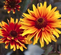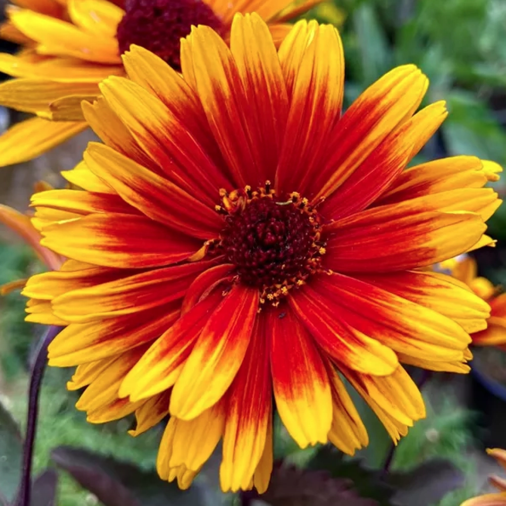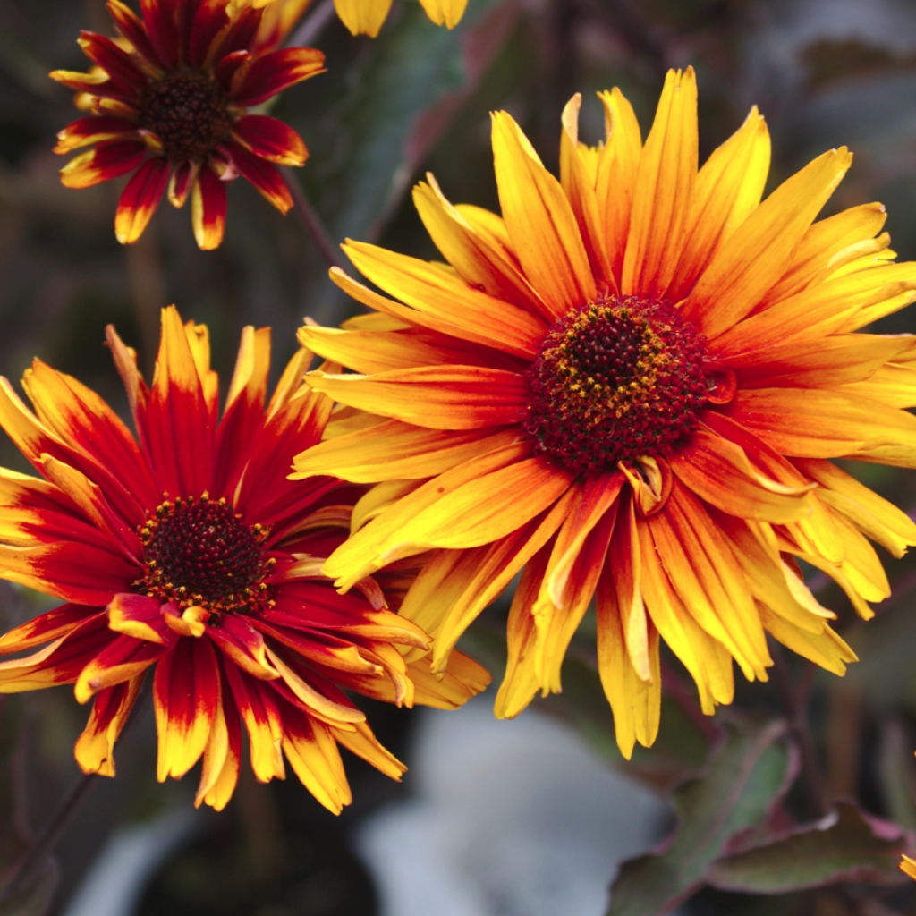 O plantă perenă deosebită, care aduce o explozie de culoare în grădină. Florile mari, duble, asemănătoare ca formă cu margaretele, sunt alcătuite din petale bicolore. Centrul florii prezintă nuanțe maronii-roșiatice, în timp ce vârfurile petalalelor sunt galbene. Frunzișul verde închis, cu tonuri violet oferă un contrast frumos cu florile strălucitoare. Înflorește bogat din iunie până la începutul toamnei, atrăgând albine și fluturi. Se plantează în locuri însorite, în sol bine drenat.