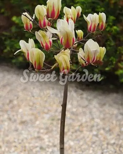Un soi îndrăgit, altoit pe tulpină înaltă, care nu ocupă loc mult. ceea ce îl face potrivit pentru grădini mici sau terase. Boboci cu tente verzui, devin flori alb-gălbui marcate cu o flacără roşie distinctivă. Parfumul magnoliei Sunrise va invada toată grădina! Livrăm plante frumos formate, în ghiveci.