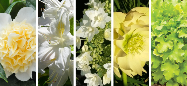 În zonele unde lumina pătrunde doar filtrat, se poate amenaja un colț luminos cu ajutorul plantelor. Camelia cu flori în nuanțe de galben-crem oferă delicatețe și rafinament la începutul primăverii, fiind urmat de azalea albă din a doua jumătate a primăverii. Hortensia macrophylla cu flori albe luminează grădina pe tot parcursul verii. La baza acestor arbuști de talie medie se vor potrivi de minune spânzul alb sau galben și heuchera cu frunziș galben-verzui, care adaugă o notă proaspătă tot sezonul. Această compoziție bazată pe tonuri deschise aduce luminozitate naturală chiar și în zonele mai întunecate.