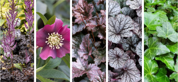 Această combinație de plante transformă un spațiu umbrit într-un decor elegant și misterios. Spânzul roșu și astilbe în tonuri închise aduc o notă dramatică, iar heuchera cu frunze violet și argintii completează tabloul cu contraste elegante și reflexe aproape metalice. Iedera urcă ușor pe garduri, pereți sau printre tufe, adăugând farmecul acela discret al locurilor umbrite. Rezultatul e un colț misterios, bogat în texturi, care atrage privirea fără a fi strident.