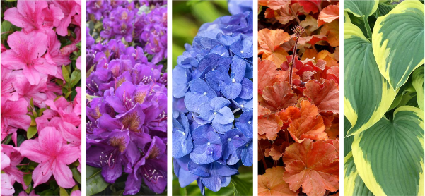 În grădinile umbrite, culorile par mai adânci, iar tonurile calde și reci se echilibrează natural. În această compoziție, azaleele și rododendronii oferă nuanțe bogate primăvara. Ele pot îmbrăca o paleta largă de culori, decorând grădina în nuanțe de roz, violet, roșu și chiar și nuanțe calde de galben-portocaliu. Hortensia macrophylla preia ștafeta din vară, florile ei schimbându-și culoarea din roz în mov sau albastru în funcție de pH-ul solului. O mare varietate de culori poate asigura și frunzișul heucherei. Crinul de toamnă bicolor adaugă profunzime și textură, întregind tabloul colorat. Fiecare plantă contribuie cu propria nuanță și formă, rezultând un ansamblu colorat, dar armonios.