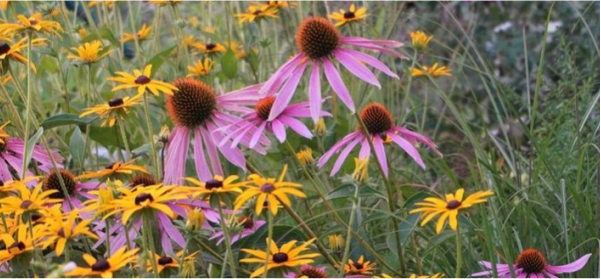 Echinacea și rudbeckia formează împreună un contrast spectaculos, roz intens alături de galben solar. Agastache și liatris adaugă verticalitate prin spicurile lor colorate, iar flutureii completează ansamblul prin florile în nuanțe aprinse de galben și roșu, ce dau impresia unui mic foc de artificii în grădină. Pe lângă efectul vizual, această combinație atrage albine, fluturi și alte insecte benefice.