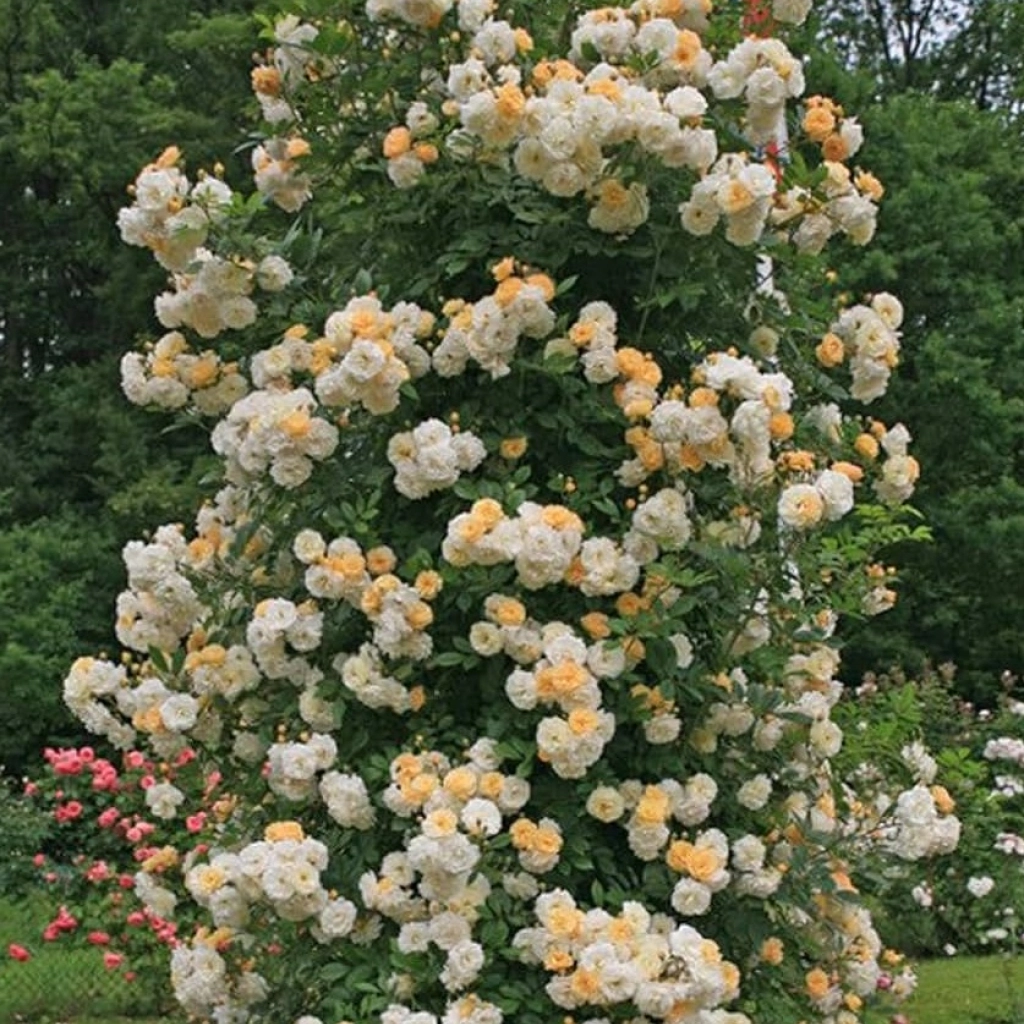 Câte nuanțe pe o singură tijă... Un decor de vis, datorită unui singur trandafir! Acest soi cățărător transformă radical aspectul oricărei grădini, conferindu-i o grație fără seamăn. Punctul său forte îl reprezintă florile, care se prezintă în mai multe tonuri de culoare, în funcție de vârsta lor. Așadar veți putea admira nuanțe de portocaliu și alb-crem, în același timp, pe aceeași tijă, nu mai spunem de întreaga tufă. Ce ne putem dori mai mult, de la un trandafir? Ei bine, în mod normal am spune ”nimic”, însă Ghislaine de Féligonde emană și un parfum extrem de plăcut, și este aproape complet lipsit de spini. Cu suportul potrivit și amplasamentul corect, unul luminos și însorit, se va întinde în voie și va înflori abundent.