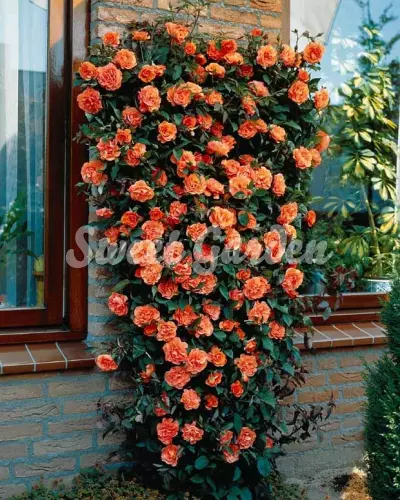 Un trandafir cățărător demn de toată admirația. Va fi piesa de rezistență a grădinii. Veselia pe care ți-o transmite acest soi este garantată, grație florilor mari, de un portocaliu intens. Acestea, împreună cu frunzișul lucios vor înviora spațiul înconjurător. Haina perfectă pentru ziduri, garduri, pergole.