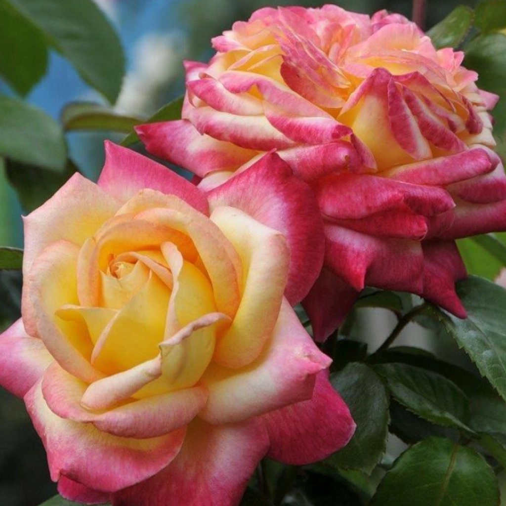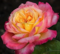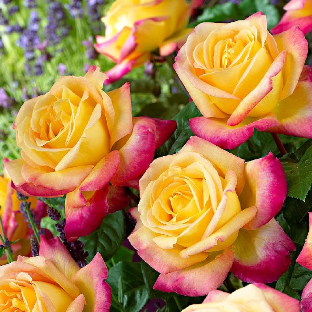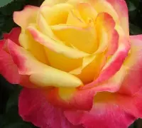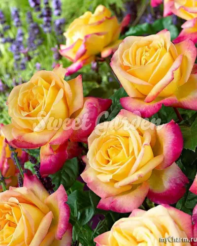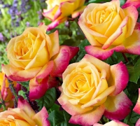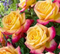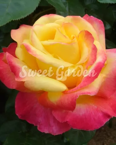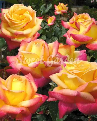 O adevărată raritate, nu doar pentru colecționarii de trandafiri, ci pentru orice iubitor de plante, în general! Florile parfumate, mari, cu diametrul de 14 cm, bicolore și frunzișul verde intens, caracterizează acest trandafir Meilland. Este vizibil chiar și de la distanță, prin cromatica vie a florilor, formate din mai multe rânduri de petale. Acestea sunt predominant galben-aurii, dar prezintă tușe roz intens pe margini.