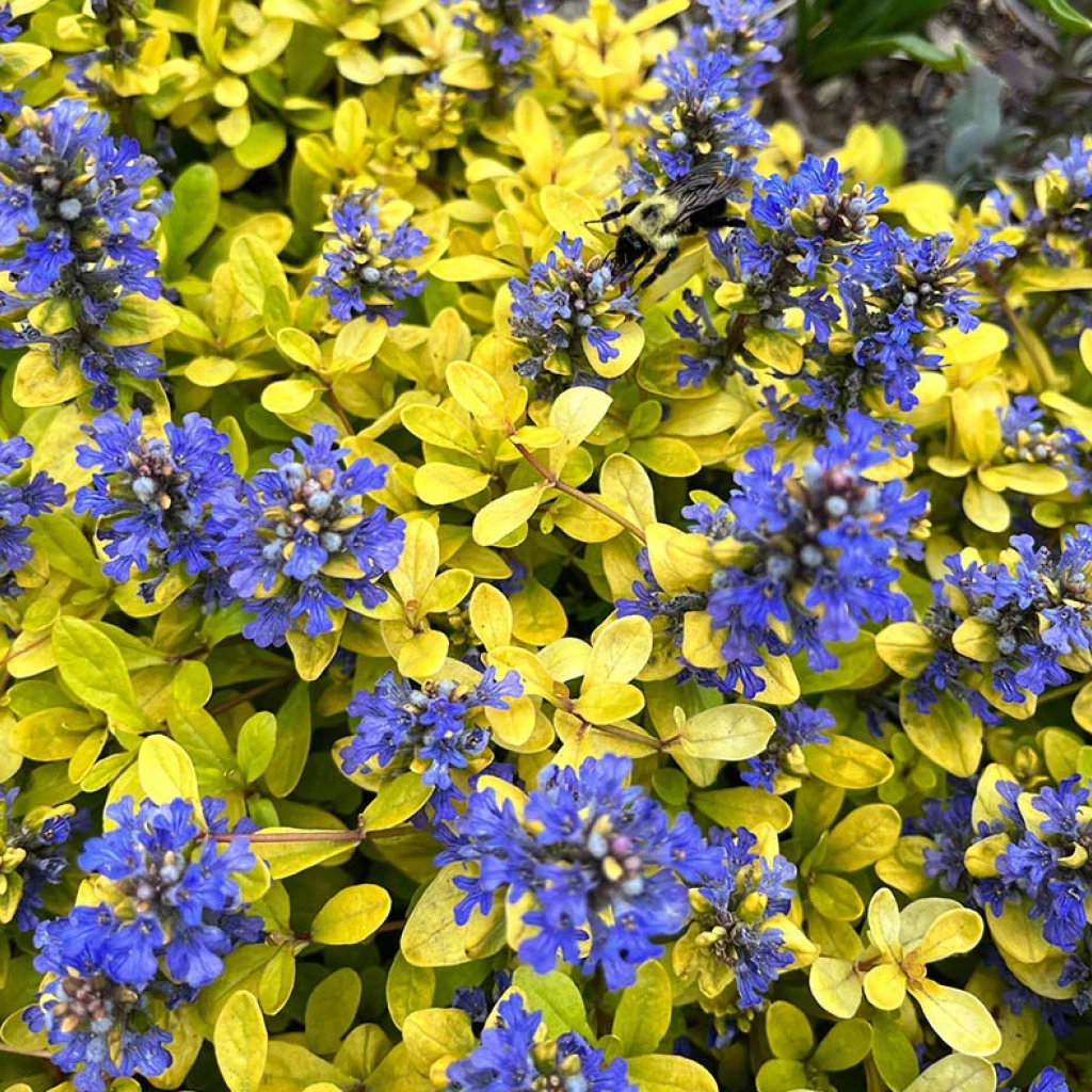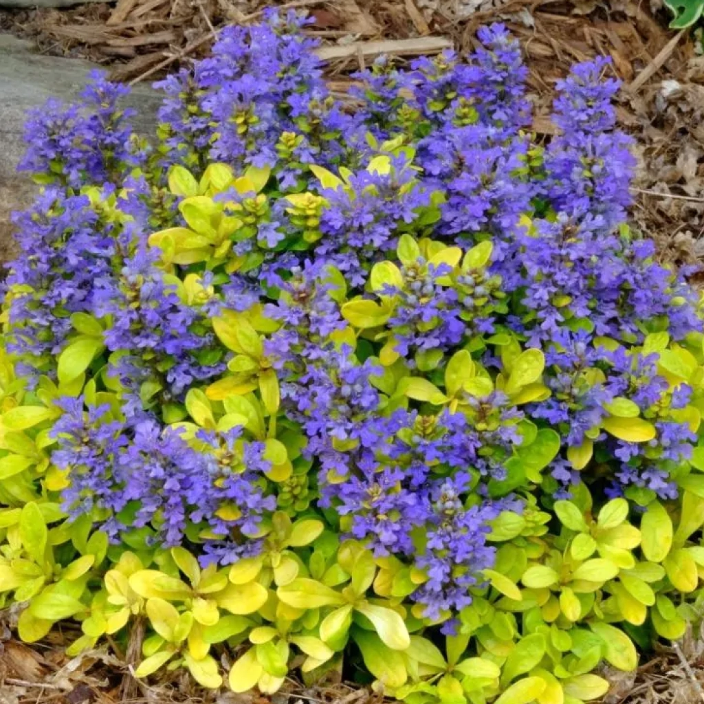 Un soi de vinețică cu frunziș auriu, oferind o alternativă strălucitoare față de soiurile clasice cu frunze verzi sau în tonuri de bronz. Covorul dens pe care îl formează rapid înfrumusețează zonele umbrite și semiumbrite, aducând lumină acolo unde alte plante nu prosperă. Înflorește din a doua parte a primăverii până în vară. Spicele de flori albastru-cobalt contrastează spectaculos cu frunzișul galben-auriu, transformând grădina într-un tablou viu. Planta este veșnic verde, rezistentă la ger, și se descurcă bine în sol bine drenat, cu umiditate moderată. Udarea ocazională în perioadele secetoase este suficientă pentru a o menține viguroasă.